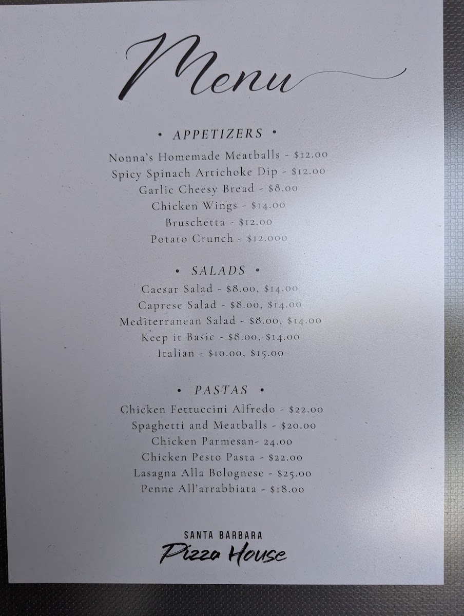 Welcome to the Santa Barbara Pizza House, a gem nestled in the heart of Santa Barbara at 515 State St. This vibrant restaurant has carved a niche for itself with its delightful menu, showcasing a variety of dishes that keep diners returning for more. Begin your meal with enticing appetizers, including Nonna's Homemade Meatballs and Spicy Spinach Artichoke Dip, before diving into their signature pizzas—like the popular pepperoni and pineapple, praised by many. The pasta offerings, from Chicken Fettuccini Alfredo to Lasagna Alla Bolognese, are crafted to satisfy all cravings. Salads like the refreshing Mediterranean add a crisp contrast to the hearty dishes. Customers rave about the attentive service and contemporary chic ambiance, making it a perfect spot for gatherings and celebrations. Whether you're a local or a visitor, Santa Barbara Pizza House promises an exceptional dining experience filled with flavor and warmth.